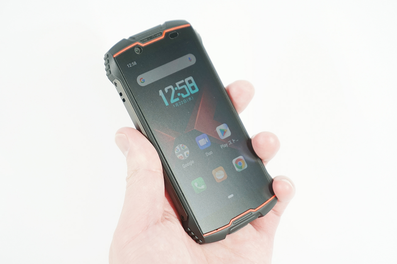 4インチで手のひらにスッポリ収まるサイズ感は、素晴らしいです。タフネススマホということで、軽さについては最軽量というわけにはいきませんが、スマホとしては十分軽いです。