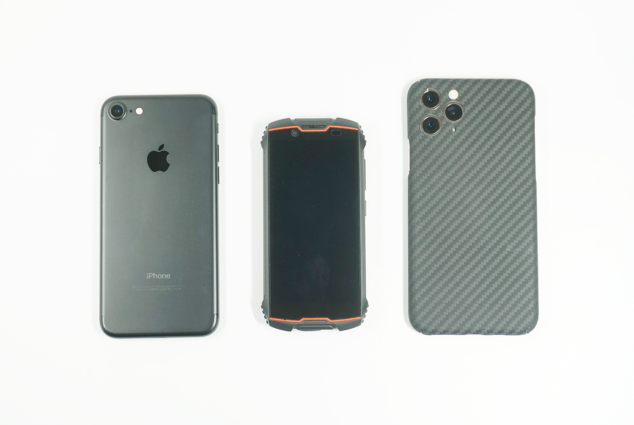 KINGKONG MINIをiPhoneとサイズ比較してみました。左が7、右が11 Pro、中央がKINGKONG MINIです。サイズ感が伝わりますでしょうか。めちゃくちゃ小さいんですよ。