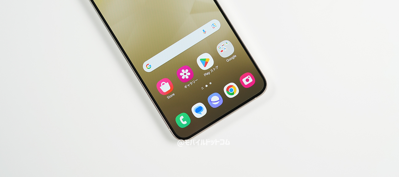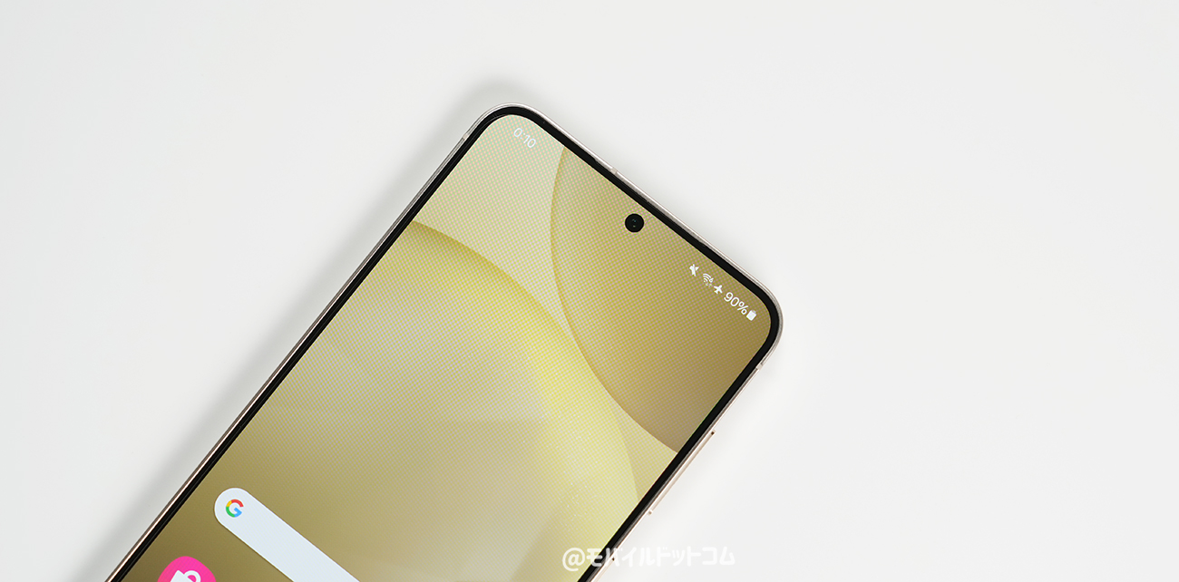 Galaxy S24は、フラットディスプレイ採用(※Gorilla Glass Victus 2)。上部には、パンチホール型インカメラを備えています。(※画面に初期フィルムはなし)