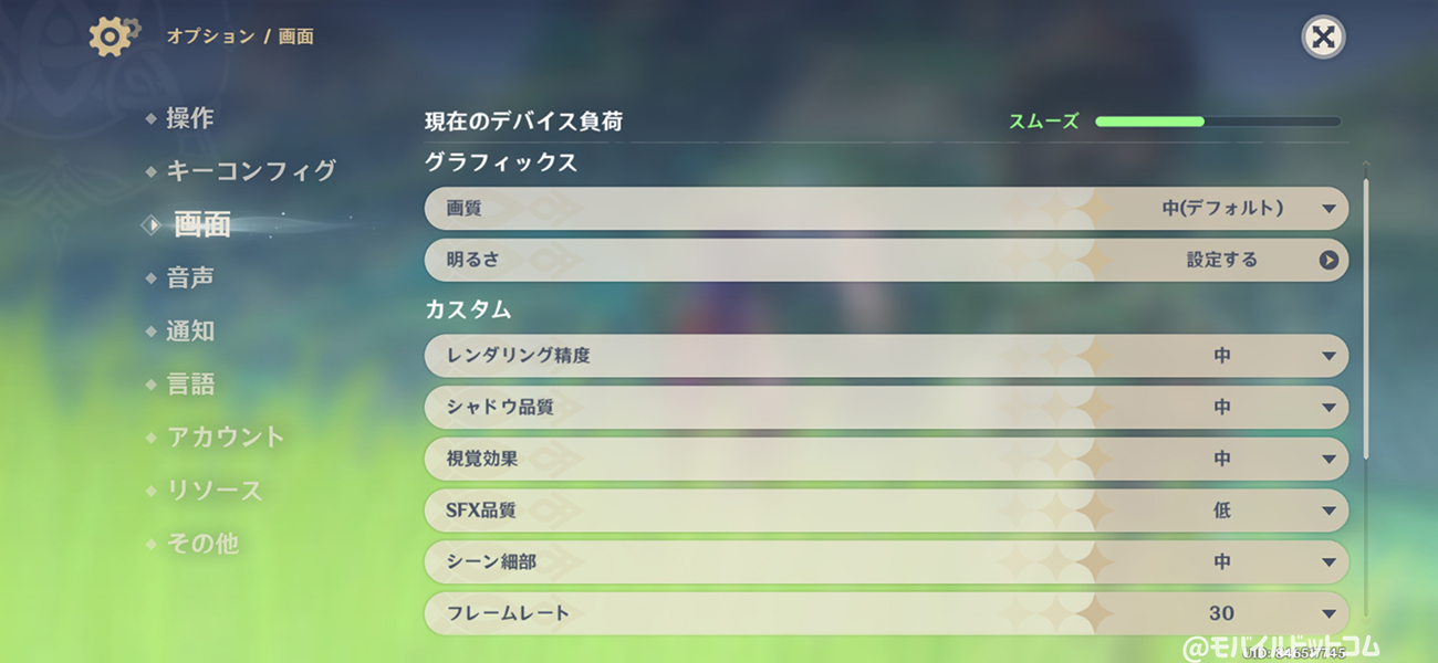 デフォルトの画質は「中」、フレームレートは「30」。動作については、最高画質+60fpsにしても"問題ない"印象です。