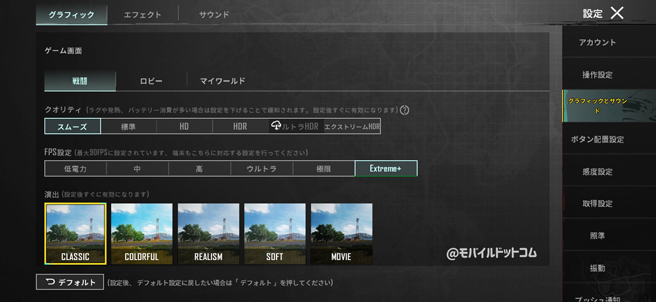 グラフィックは「ウルトラHDR」で「ウルトラ」まで選択でき、「スムーズ」は「Extreme+/90fps」まで選ぶことができます。