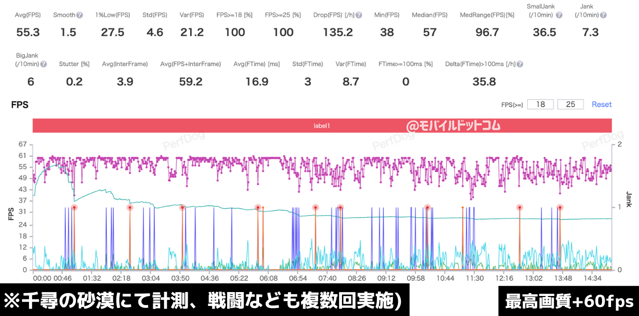 原神にて最高画質+60fpsへ設定変更後、平均fpsを「WeTest PerfDog」で計測。30分間の計測では、平均55.3FPSでした。(※千尋の砂漠にて計測、元素スキルや元素爆発など使いつつ戦闘も複数回行いました。)