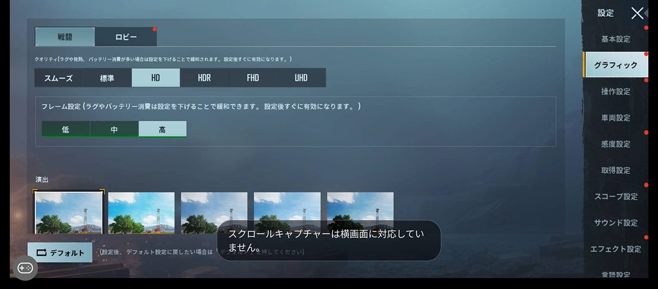 グラフィックは、「HD」で「高」まで選択でき、「スムーズ」は「ウルトラ」まで選ぶことが可能です。