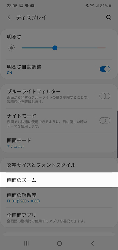 ホーム画面にある設定アプリから進み、ディスプレイから画面ズーム