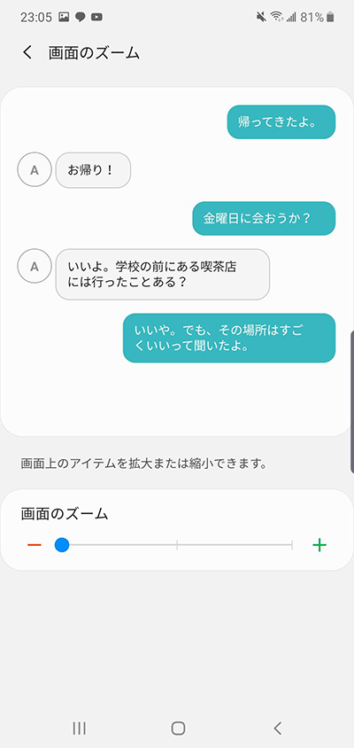 バーを移動しながら調整が可能なので、中央の表示サイズ見本を見ながらちょうどよいサイズにしておきましょう。