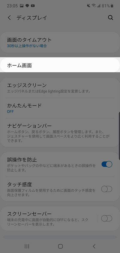 ホーム画面にある設定アプリから進み、ディスプレイからホーム画面