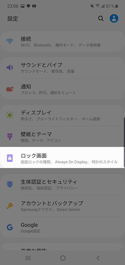 ホーム画面にある設定アプリから進み、ロック画面からAlways On Display