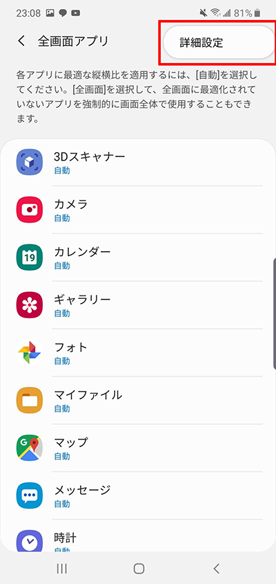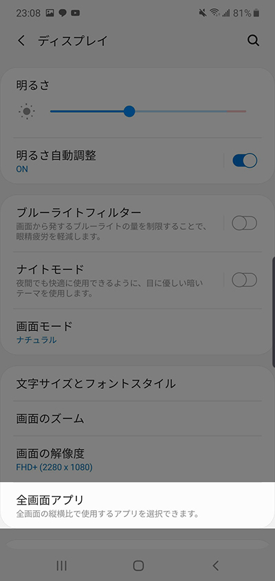 ホーム画面にある設定アプリから進み、ディスプレイから全画面アプリ