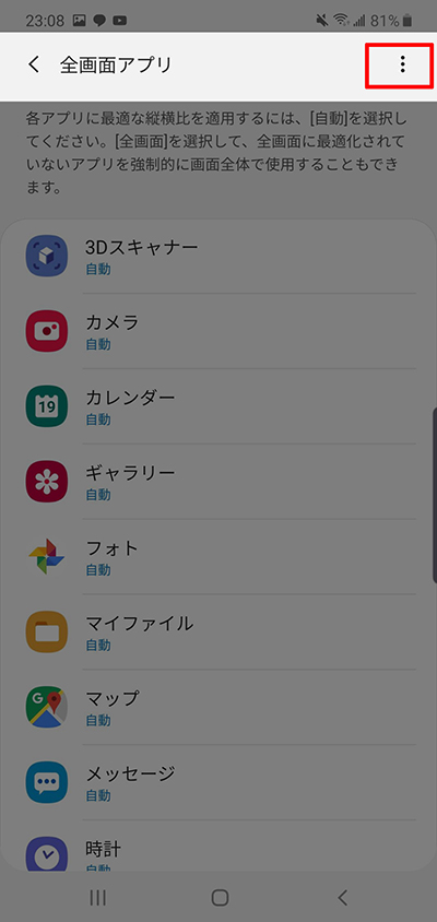 ホーム画面にある設定アプリから進み、ディスプレイから全画面アプリへ進みます。