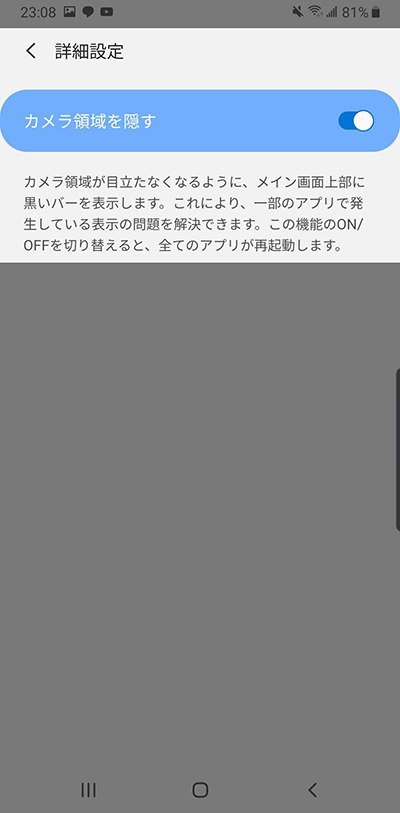 全画面アプリ>フロントカメラを隠す>オンオフ