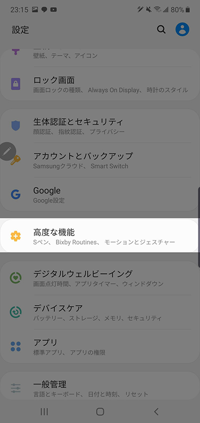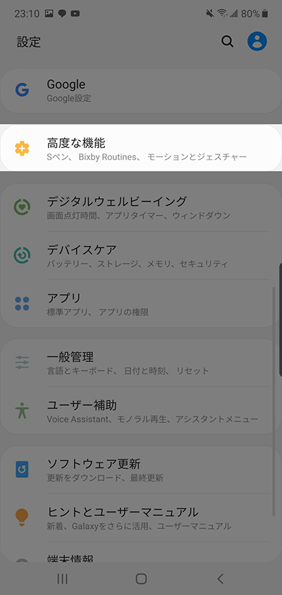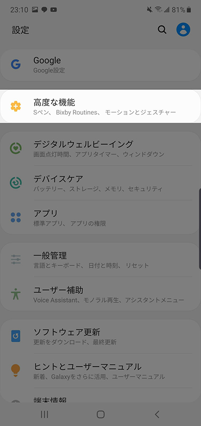 ホーム画面にある設定アプリから進み、高度な機能からSペン