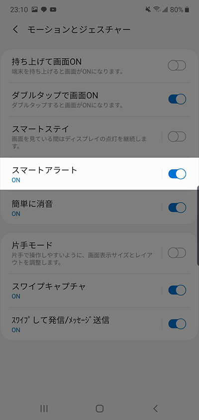 モーションとジェスチャーからスマートアラームのオンオフを設定出来ます。