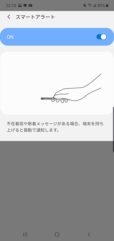 スマートアラームは、本体を持ち上げた時に新着通知や不在着信があると振動で教えてくれる機能です。