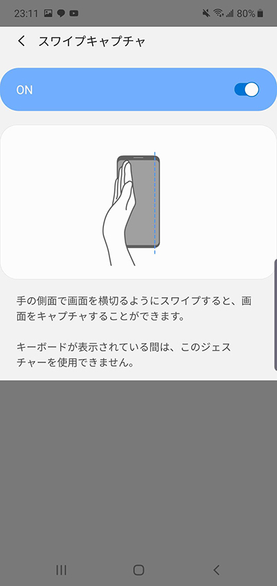 スワイプキャプチャは、手の側面で画面を横切るようにスワイプするとスクリーンショットが撮れる機能です。