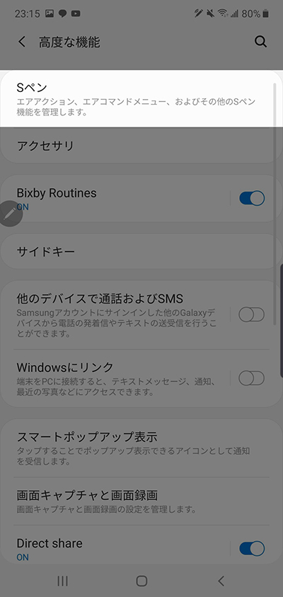 ホーム画面にある設定アプリから進み、高度な機能からSペンへ進みます。