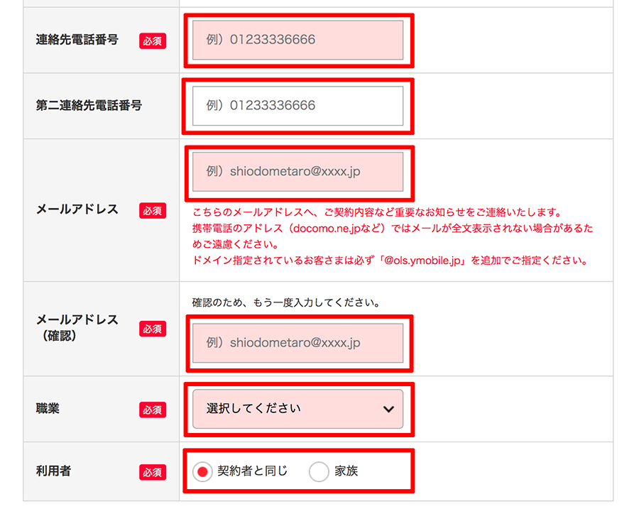 次に、赤枠の契約者情報を一つずつ埋めていきましょう。利用者については、契約者と同じであればそのまま変更せずに進んでください。