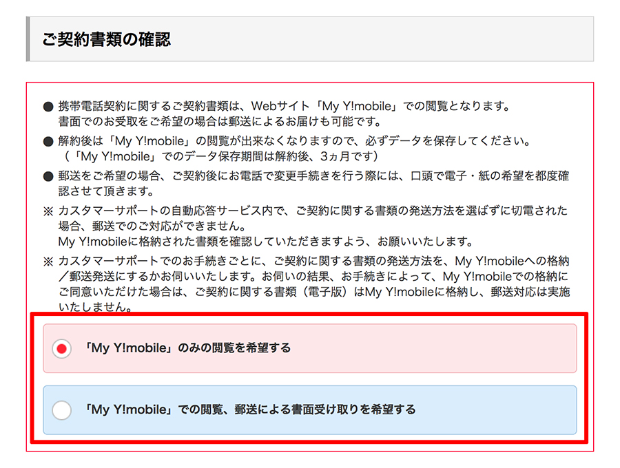 次に、契約書類の確認方法です。書類を郵送するか、もしくはネットで見るかを選択することが出来ます。
